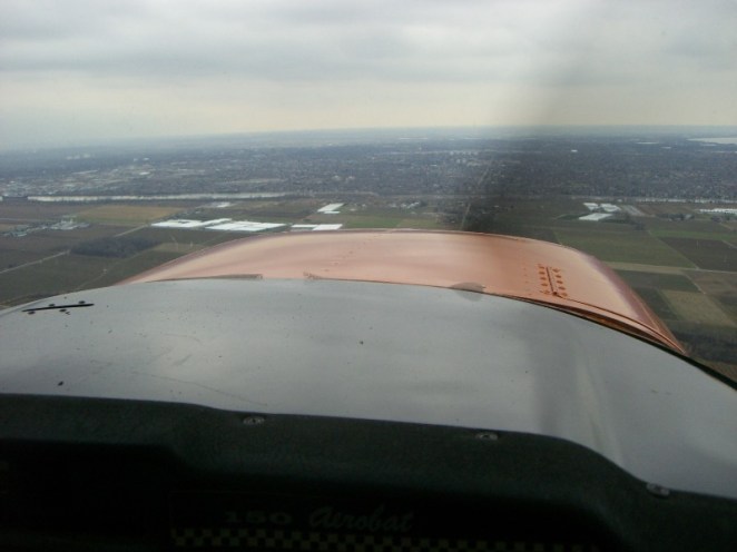After inspecting the plane and chatting with Scott, John and I managed to figure out the harness system, strapped ourselves in and made our way over to the runway. The run-up went well with no issues. We cranked him up and barreled down the 2007 foot runway, lifting off about half way down. Vyctor handled great! I could tell he was a little heavier than my other plane, but seemed very maneuverable. We were able to climb to about 3500 feet for the majority of the two hour flight home. I wasn’t too eager to get back, since I knew I wouldn’t been flying this plane again for one to two months. Regardless, it was a long day and it was nice to see the Niagara District Airport. Here we are in the circuit for runway 06: