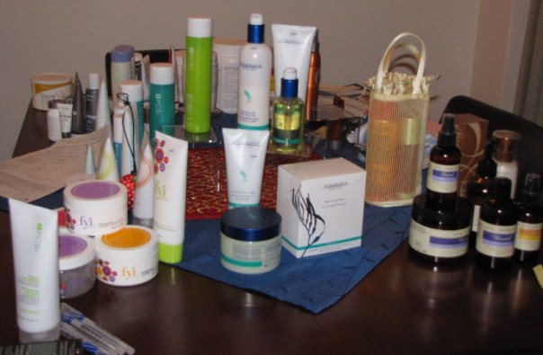 As the hostess of the party, I got quite a few deals on the vast array of products. I splurged a little more than I had planned, but it’s all good! The Arbonne rep brought tons of products to demonstrate. I forgot to take a picture of the table when it was all set up – here’s a shot during the clean up: