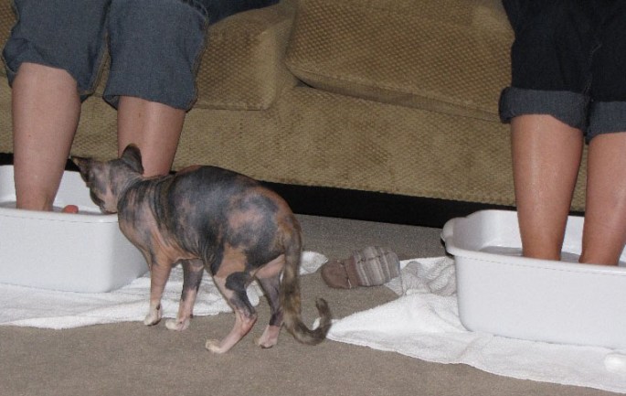 Gee, I feel bad I haven’t posted this week, but there wasn’t anything to post! Until last night, it was a very uneventful week. We were offered overtime at work and I took advantage of it one night. I also worked today from 8:00 to 2:00. I cannot believe how much I got done in those six hours! I had my headphones on, my music cranked and I only stopped twice for a pee break and to run out and grab a coffee. Actually, I’m surprised I was able to make it in for 8:00. I had a little gathering at my apartment last night, with an Arbonne product demonstration. We did a foot soak, which I’ve never done before. Clearly, from the pictures below, my cats were a little jealous:
