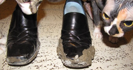 The meeting went very well. Since the airport is under construction and totally torn up, I suggested everyone bring a flash light. It wouldn’t be too safe walking back to their cars at night, considering the uneven and yucky ground. I had two small flashlights, but was mostly pointing them behind me for the other people walking. My shoes paid for this big-time. Yucky is right! My cats were quite shocked when I got home: