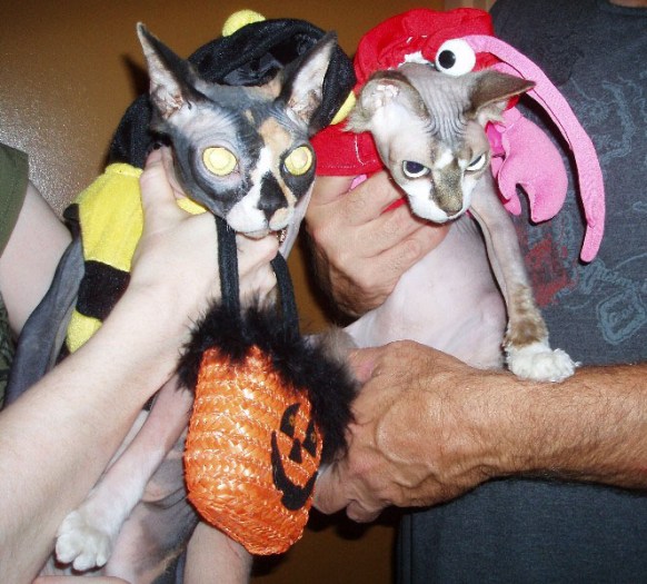 Fortunately for the kitties (and humanity in general), I only dress them up for Halloween and when it’s really cold in the apartment. Mya does not seem to mind wearing her little fleece sweater when it’s cold. Anyway, we did dress them up and took them trick-or-treating to a few units in our apartment building. We first took them to the apartment at the end of the hall, to see the nice folks that live there. They have a bird so Abby wasn’t allowed in due to the fact that she would lick it to death. Here is a pic of Abby dressed up as a bee (get it?) and Mya as a lobster: