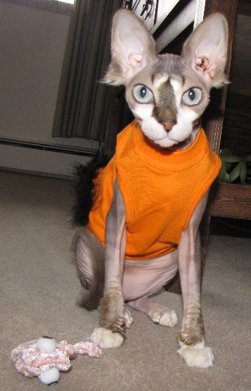 The little shrimp toy is at her feet. I didn’t notice the feathers on the outfit when I bought it. Abby seems to enjoy licking feathers, so Mya got licked to death while wearing her new clothes:
