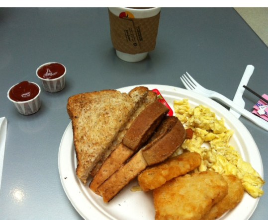 My cheers quickly ceased when the stinky ol’ tower called and asked that I taxi down to the next runway (thick black line) and turn right there instead. Ugh! My Queen wave quickly turned into another gesture. Anyway, we taxied over to the restaurant and were shocked that it was closed. Ugh again! I could see it being closed for the holiday tomorrow, but why the heck would they close it Sunday? Someone came out to ask what we were doing there and said that we could walk over to the terminal building and go to the Timmies instead. Yeah, I just flew an hour to go to Tim Hortons! Oh well, we decided to head over. There was another little grill place next to Timmies and we ordered breakfast from there. Jan wasn’t too impressed but it was better than nothing: