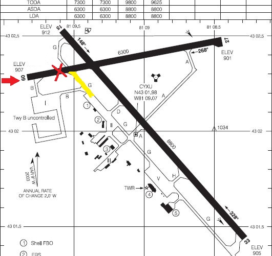 It was a perfect, calm day so Jan and I decided to fly to London for breakfast this morning. Jan was quite happy it was a very smooth, hour long flight. I’m always up for a challenge, so when I was cleared to land on runway 09, I decided I would attempt to land and stop the plane in time to taxi onto the first taxiway. I would have to come in rather slow and touchdown soon after the runway numbers. I cheered when I was able to do it! Wouldn’t the control tower folks just be absolutely thrilled that I could taxi off the runway within seconds of landing?! Here is the diagram of the airport. I was able to land and have the plane stopped by the red X, which meant I could easily turn onto the first taxiway (yellow line):