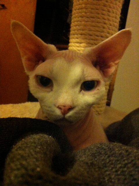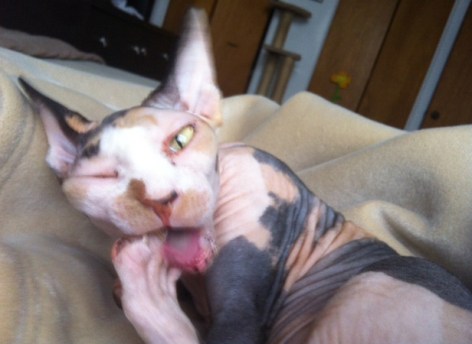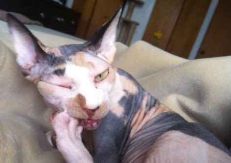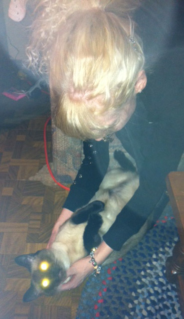 On Saturday, I went to my boyfriend’s for dinner. I was able to meet his older sister, her hubby and their two adorable boys. I had such a great time. It was also nice to see his four Siamese cats. Here I am giving headlight-eyed Coco a rub down:
