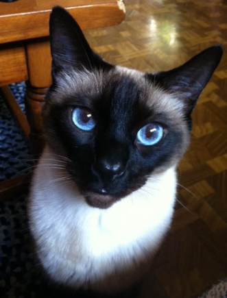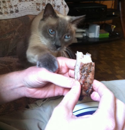 He’s so cute – all four of his kittahs are adorable. Here’s little Blue trying to help himself to one of Mike’s ribs: