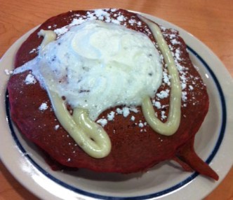 Mike ordered these awesome red velvet pancakes: