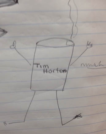A couple days ago, we had a meeting at work. It was actually very interesting, as it was about a new project which I am a part of. Despite it being a good meeting, at the one hour and fifteen minute mark, I was starting to crave a coffee. I nudged the girl next to me, pouted and whispered “coffeeeeeee” in her ear. Her response – this amazing, life-like drawing of a dancing Tim Hortons coffee: