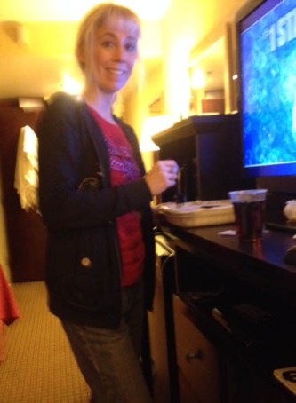 We were kinda disappointed when we found out that the included dinner at the hotel was only Monday – Thursday, so we had to go find our own noms. We headed over to Wegmans and got some really good food. Neither my mother or I wanted to eat on the bed, and there was only one chair at the desk in the room, so I just stood in front of the TV whilst nomming: