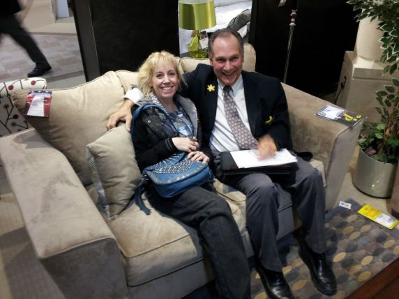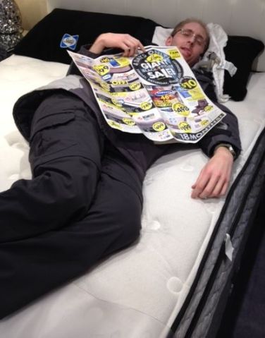 I was a total nut during the two and a half hours we were there. I kinda felt bad for Chuck, who was helping us out. I asked him for a reinforced bed frame to support my morbid obesity, called him “Chucky Boy” at one point, and had a really hard time not making faces while the kid wandering around us was horking and hacking all over everything. I even got him to pose with me for a pic: