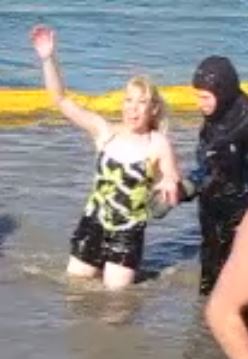 Finally, our wave was given the signal to go. Mike took a video, which I will be posting in my video section. One of us females kept saying “Oh God, oh God….” When my feet hit the water, it felt like blades going into them. I have very sensitive skin, especially to extreme temperatures – just an MS thing. I knew I had to keep going as I would never forgive myself for not going all the way. I got in just past my waist then stuck my head in. My hair kinda floated on the surface: