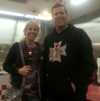 Had an interesting experience on Saturday night. Mike and I went to visit his sister and family in Stoney Creek. We decided to pick up noms for everyone at the Five Guys restaurant that just opened on Centennial Parkway. There was a guy and his kids behind us in line. While Mike was ordering, he tapped me on the arm and asked if I did a blog. At first I thought he asked if I was blonde. I felt like saying “Duh!” Then I thought I was going to have to try and convince him that this is my natural hair colour. I asked him to repeat himself and that’s when I realized he said “blog.” He said his mother is a loyal follower of my blog and that he himself had just seen it with her last week. Small world, eh? His wife took a pic of us and sent it to his mother: