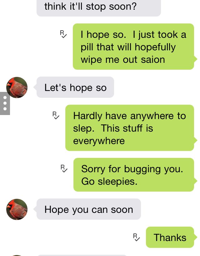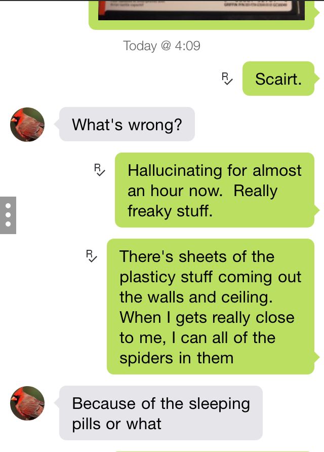 It was a perfect weekend, but I think I may have done a tad too much. I was physically pooped and emotionally drained from the movie. I was in bed by 9:30. I fell asleep after 11:00 but was up a couple hours later. That’s when things weren’t so fun anymore. When I am super exhausted and extremely fatigued, I sometimes hallucinate. It only ever happens at night. The last time was probably two years ago. Around 2:00am, I started seeing stuff. My hallucinations typically have spiders in them, I guess because I hate them so much. Anyway, while it’s all going on, I am completely aware that I am hallucinating and what I’m seeing and sensing isn’t really there, but it seems so real that the fear is still there. I honestly can’t believe people voluntarily take drugs to hallucinate. I hate it – why the heck would anyone want to go through that? Is there such thing as a good hallucination? The stuff last night was horrible. I wanted to call someone so badly to have them just be there as support. I ended up texting my mother just after 4:00am. Here’s our conversation. Just keep in mind, I’m still seeing everything I’m describing. (My poor mother!):
