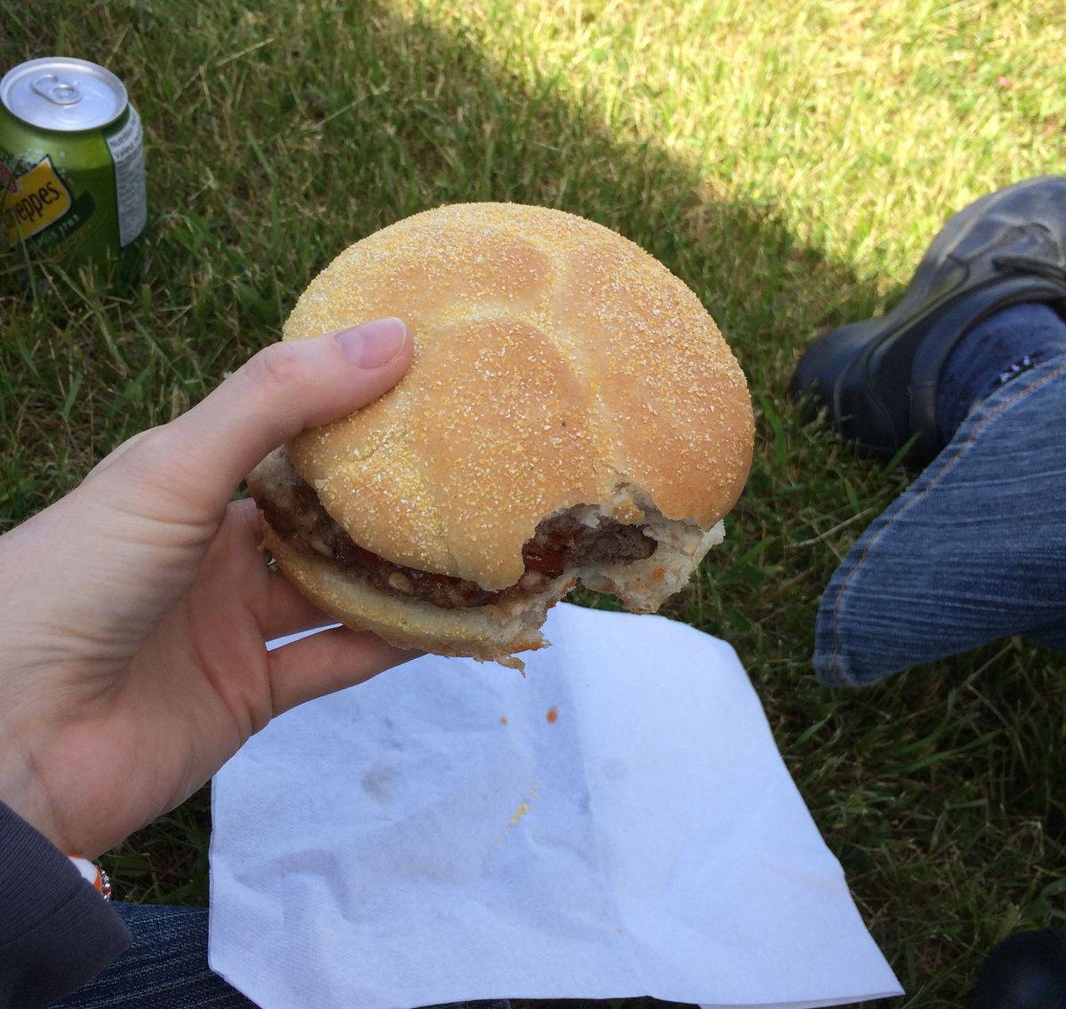 We were both rather hungry so we grabbed a burger from the BBQ. The only seats were in the sun, and since we’re both the colour of bleached socks, we searched for shade. The only shade available was under the wings of Vyctor, so that’s where we sat and nommed: