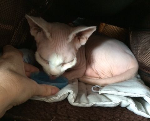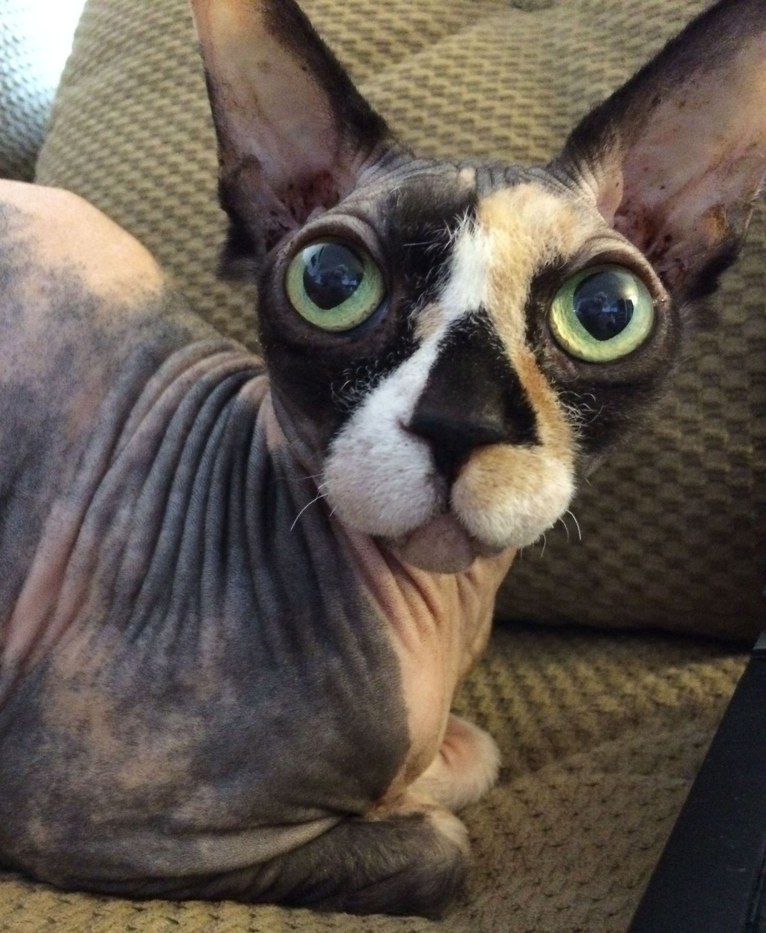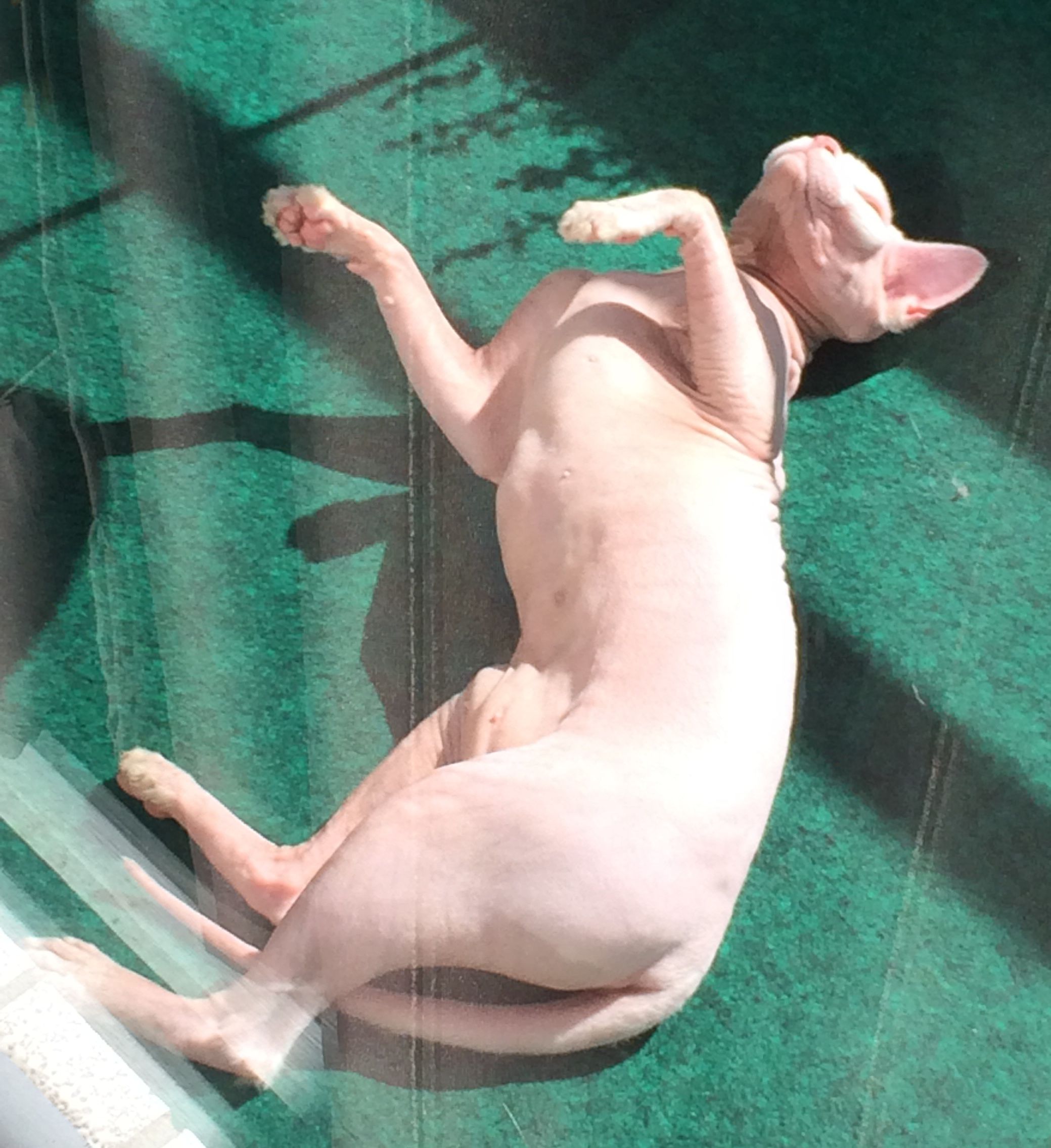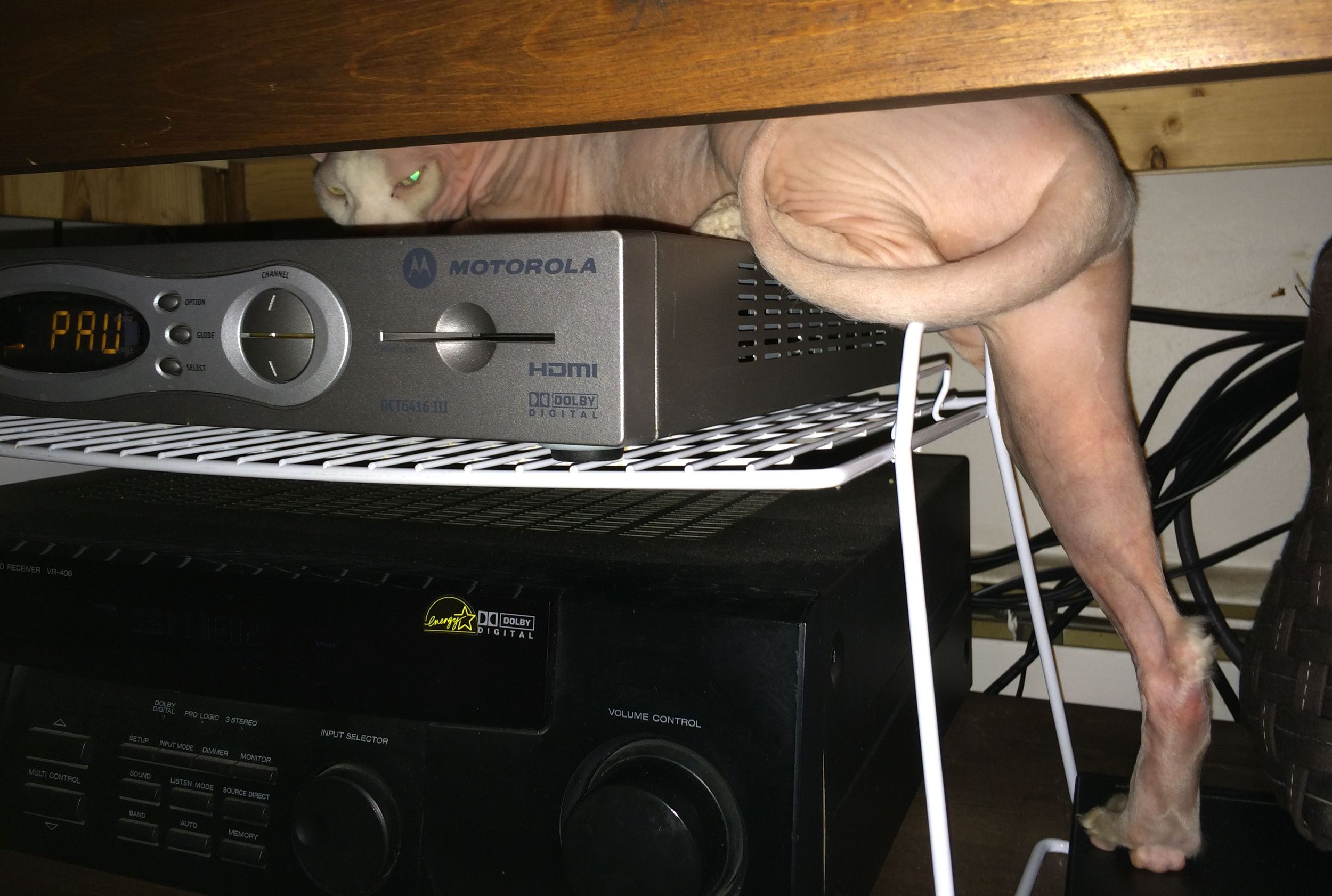 Since my kitties are hairless, they are always looking for warm spots to sleep. They were laying on my cable receiver for the last year. I’m always nervous one is going to be sick on it, so I figured out a way to keep them off – so I thought. I have my audio receiver on the bottom, and over that is a wire shelf which holds my cable receiver. How in the world naughty little Pinky ever got up on it in that configuration is completely beyond me: