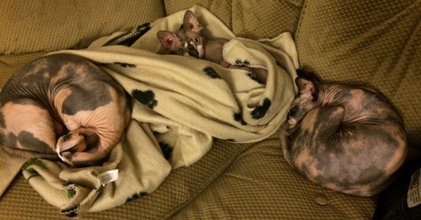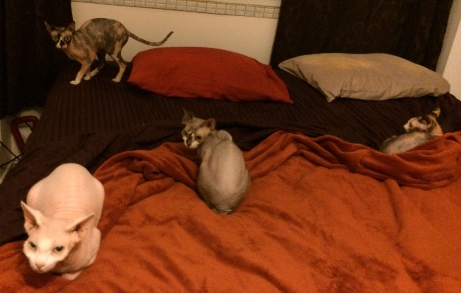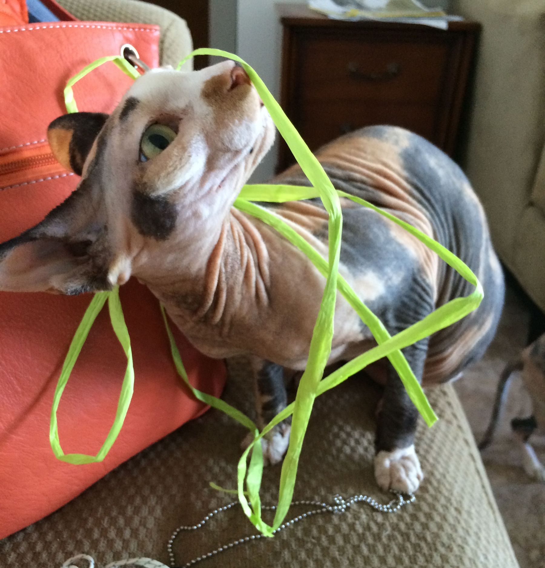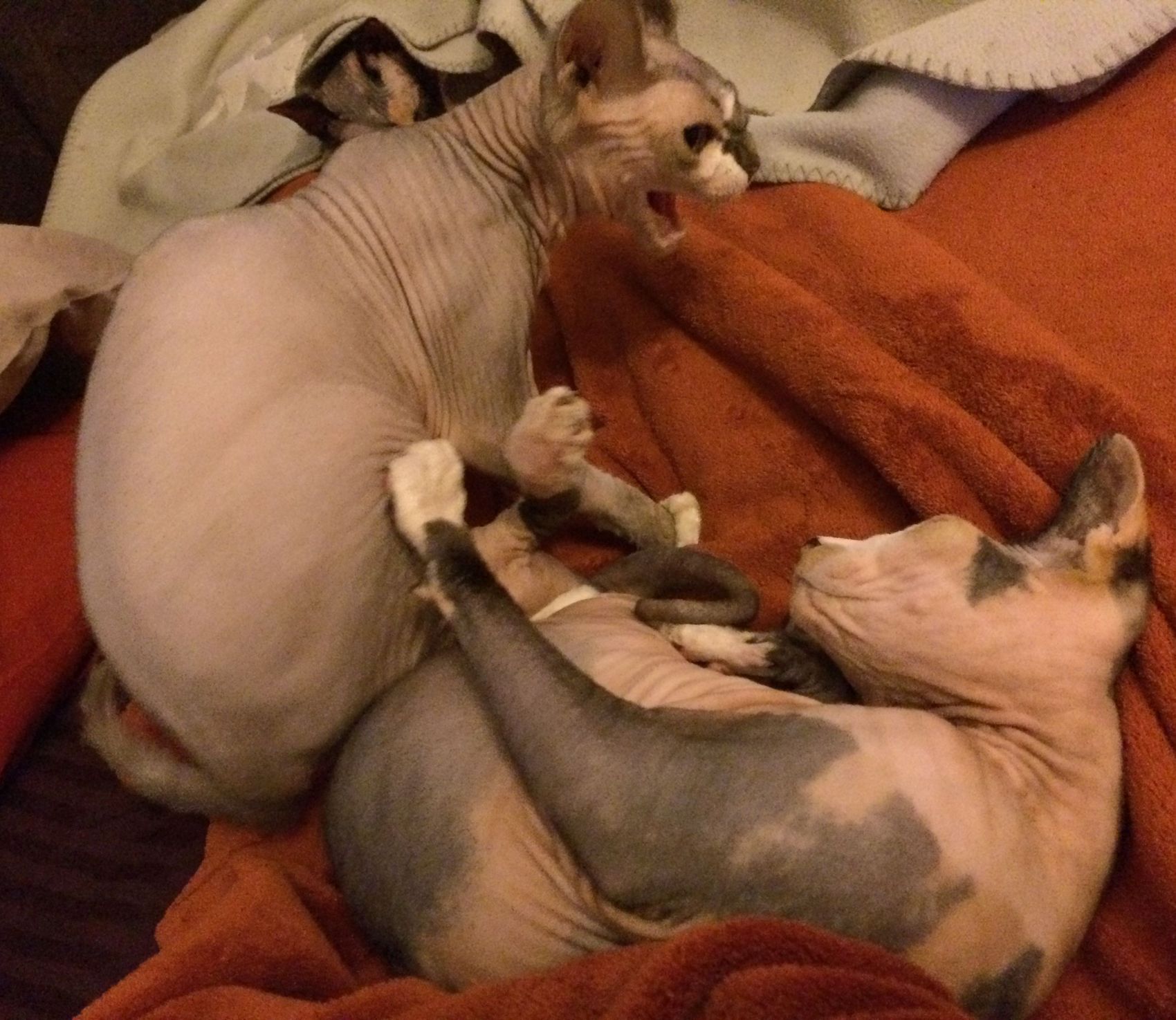 Sticking with the naughty theme, my oldest sphynx is a five pound bully. She’s also the sweetest cat I’ve ever known – most of the time. Whenever another kitty gets all snuggly and warms up a spot, Mya will sometime walk on them until they move and surrender their spot to her. Sometimes she goes a little too far and bites them on the bum. She was doing that to little Abby (who is bigger than her) while she was on the bed. I Mya-proofed Abby by turning her into an Abburito: