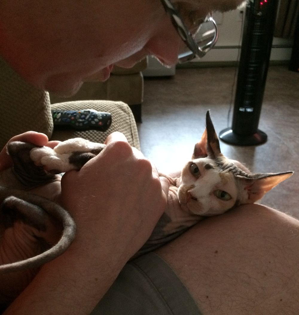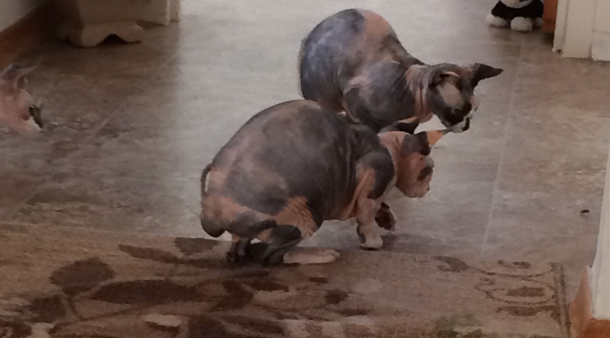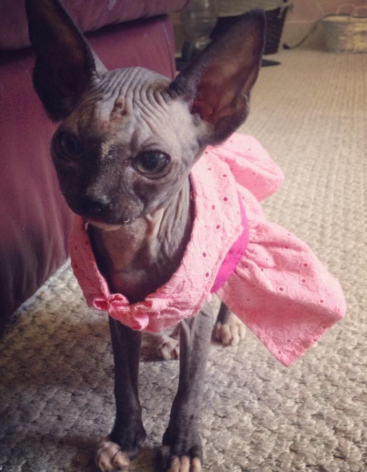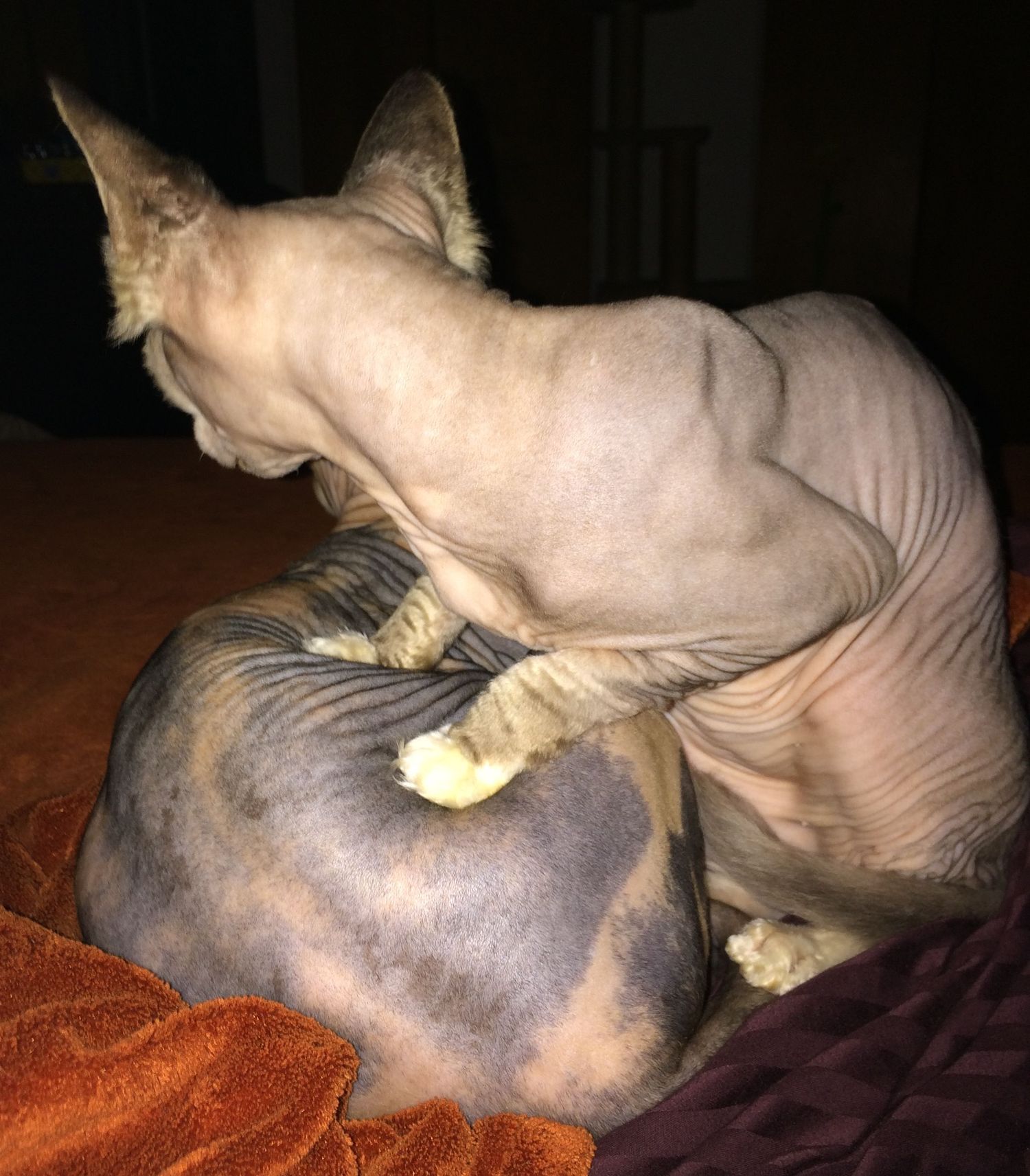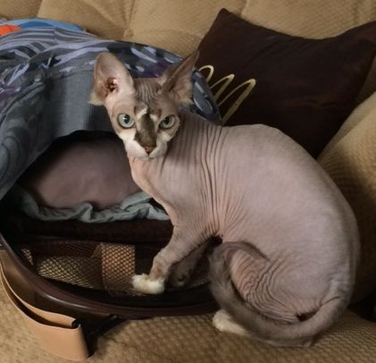 Sticking with the naughty theme, my oldest sphynx is a five pound bully. She’s also the sweetest cat I’ve ever known – most of the time. Whenever another kitty gets all snuggly and warms up a spot, Mya will sometime walk on them until they move and surrender their spot to her. Sometimes she goes a little too far and bites them on the bum. She was doing that to little Abby (who is bigger than her) while she was on the bed. I Mya-proofed Abby by turning her into an Abburito: