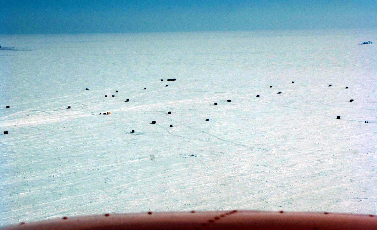 On the way back, I flew us over to Long Point (where we go camping twice a year) to see the ice fishermen. I fly over them each year and this was Mike’s first time.