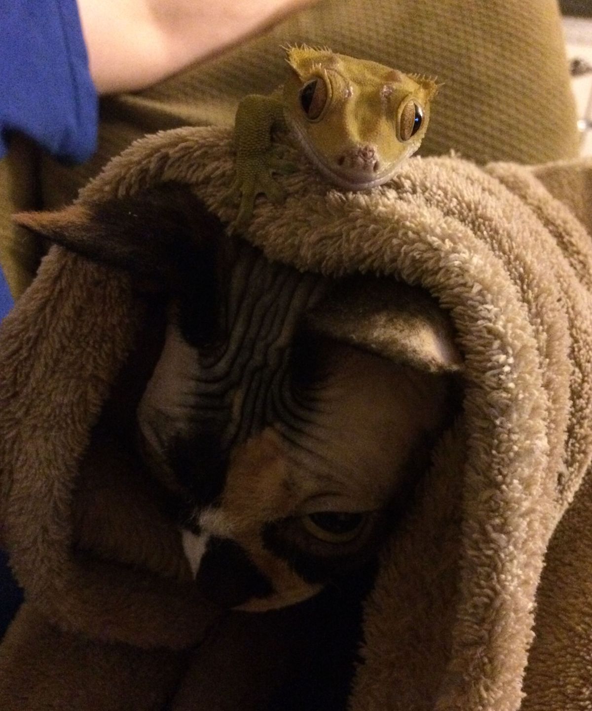 He still has a little scrape on his schnoz from when he jumped into the screen on top of the cage, face first. Not too swift. He was a little less destructive while perched on Abby’s head: