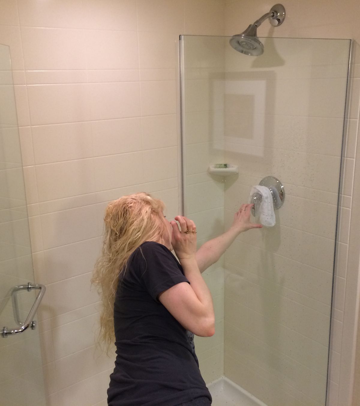 If you were any shorter than me, you would literally have to be standing in the shower to turn it on. Yeah, that’s fun during the first minute while the water is warming up. Ugh! Not sure who was the designer of such a disfunctional shower. On a bright note, they did put the floor numbers at eye height for my mother, if she were to ever stay there: