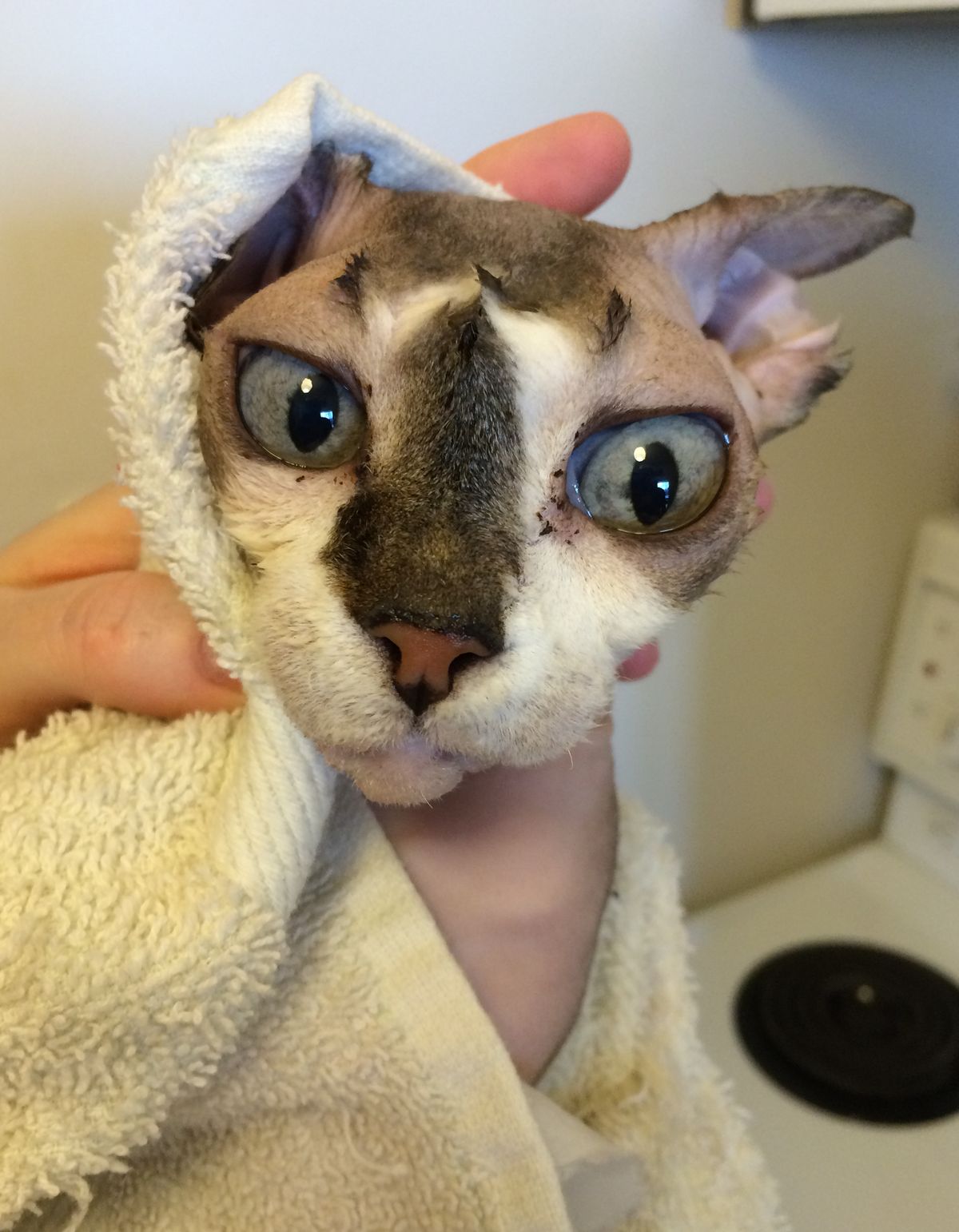 Oh how we torment the kitties sometimes! Like during their baths. Even though Mya is the oldest and supposed to be a role model, she is a total screecher during her bath. As you can see, she wasn’t impressed: