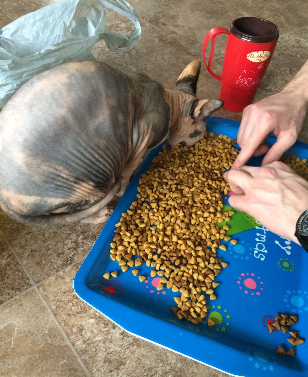 Speaking of noms, as I mentioned in my last blog, I have to sort out the new hypoallergenic dry cat food from the stuff I usually feed my goobers, as it’s making Pinky sick. I’m happy to report, Mike and I finally got all of the new food picked out of the old stuff, kibble by kibble: