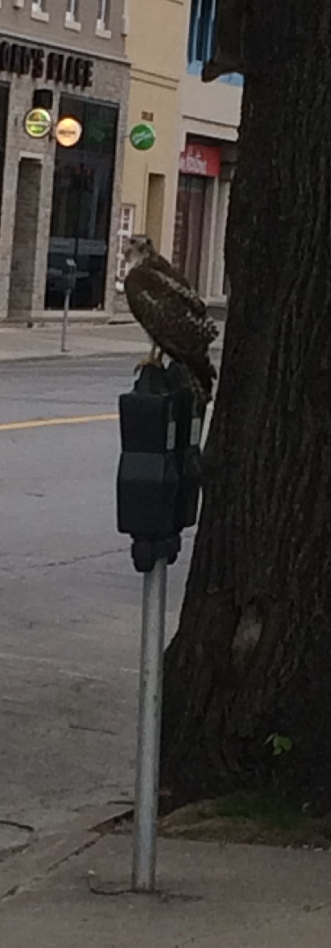 Last week while walking to work, I stopped in my tracks when I saw this awesome hawk perched on a parking metre. Check out the slightly terrified looking squirrel on the tree above him: