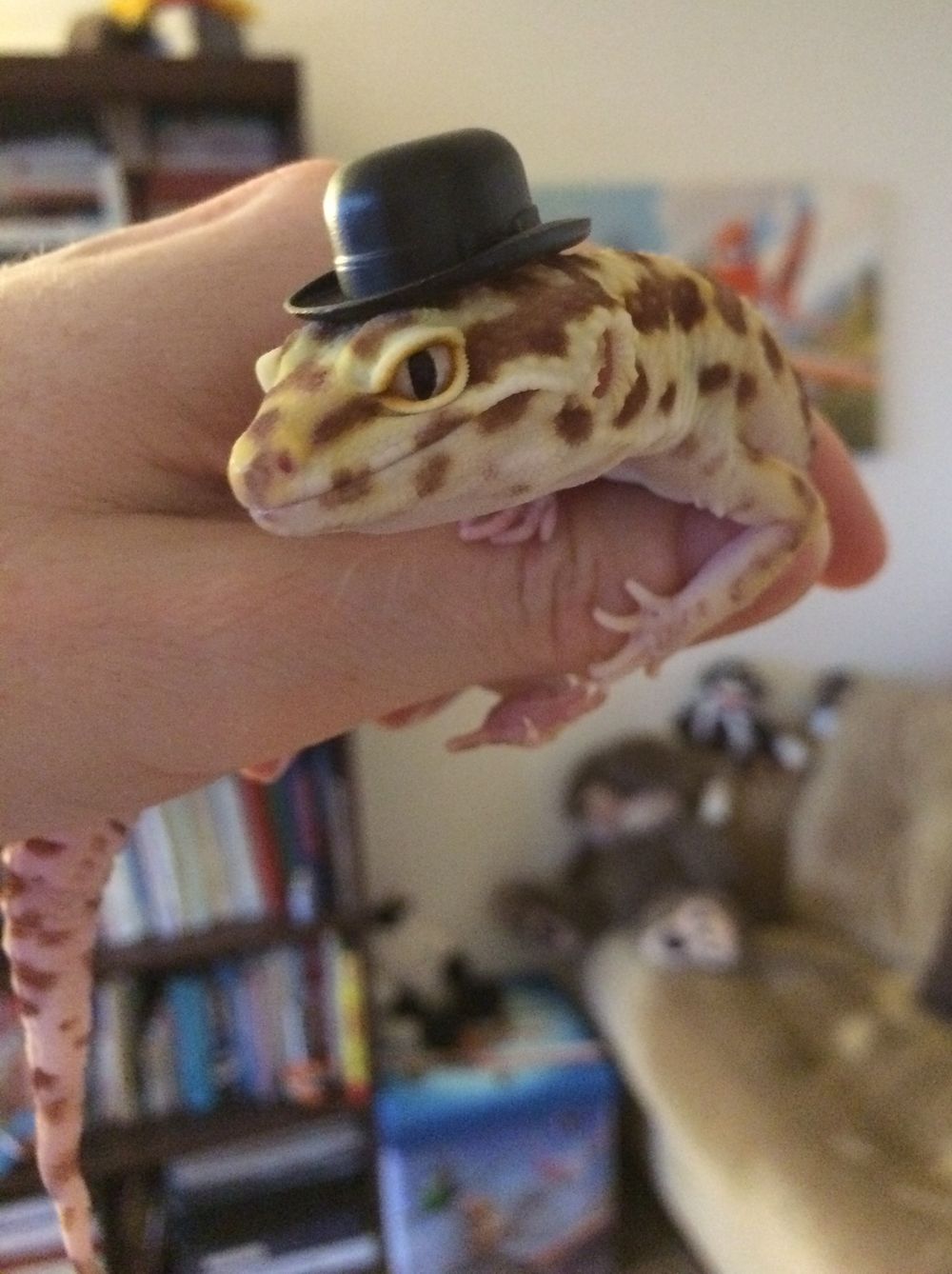 Another great thing that happened recently was Zim the gecko being initiated into my family. All of my non-human loved ones must be dressed up for a quick photo shoot. I used the same hat I had on Peanut a few weeks earlier. He’s so charming!