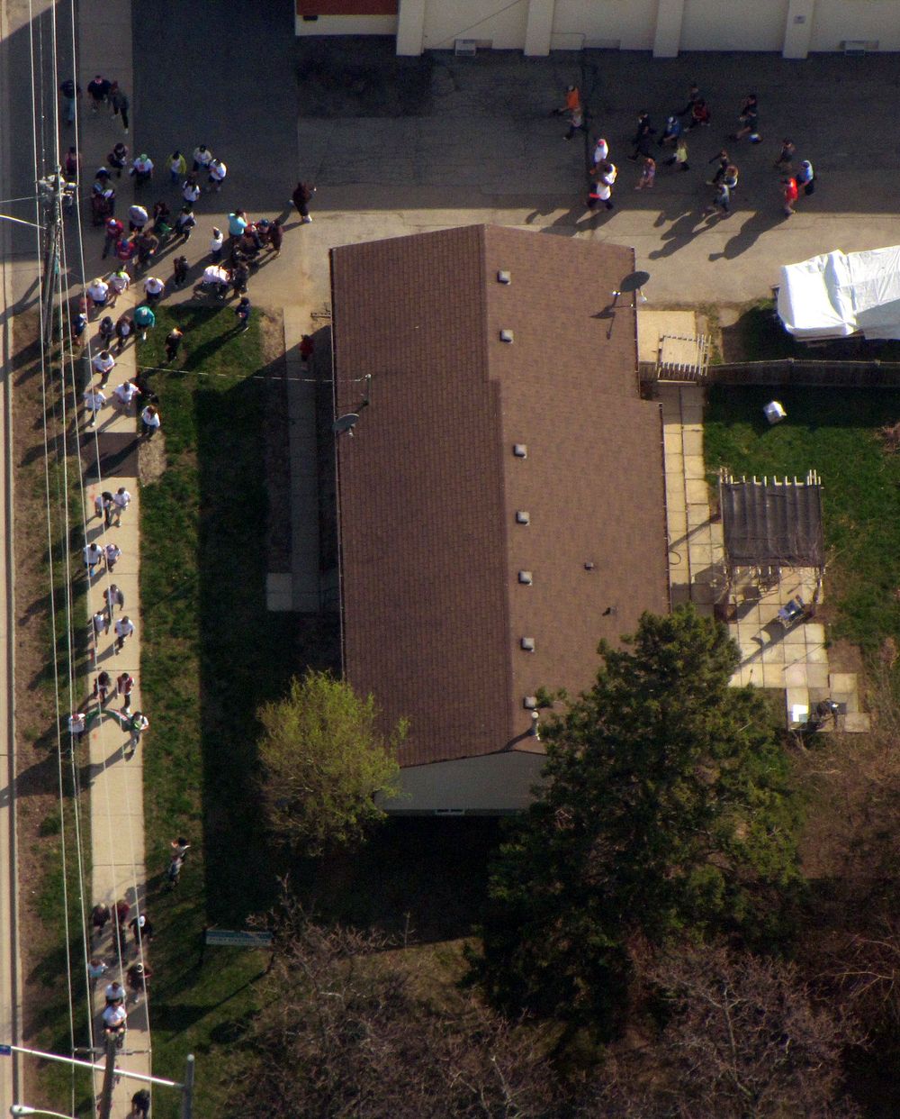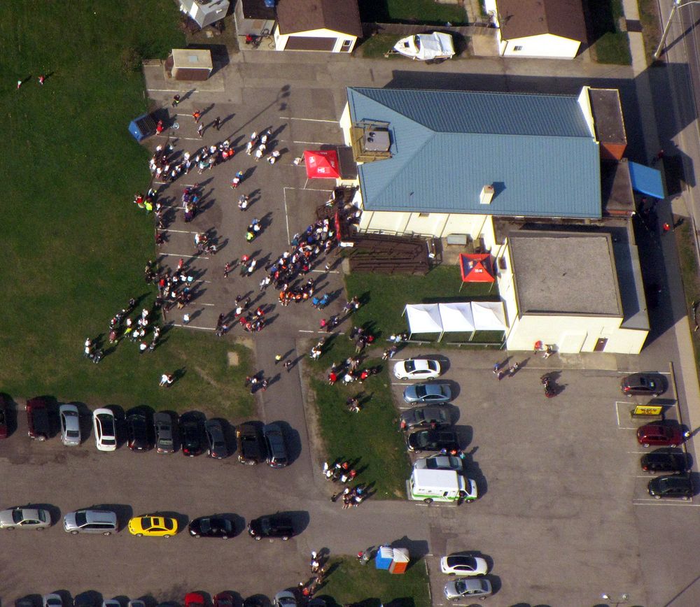 The annual Walk for MS was this Sunday and fortunately, the weather was perfect.  The St. Catharines and Niagara Falls Walks both started at 9:00.  As I do every year, since it usually has the most Walkers and is the closest to the airport, I fly over the St. Catharines site first.  Here’s a shot of everyone before the Walk started: