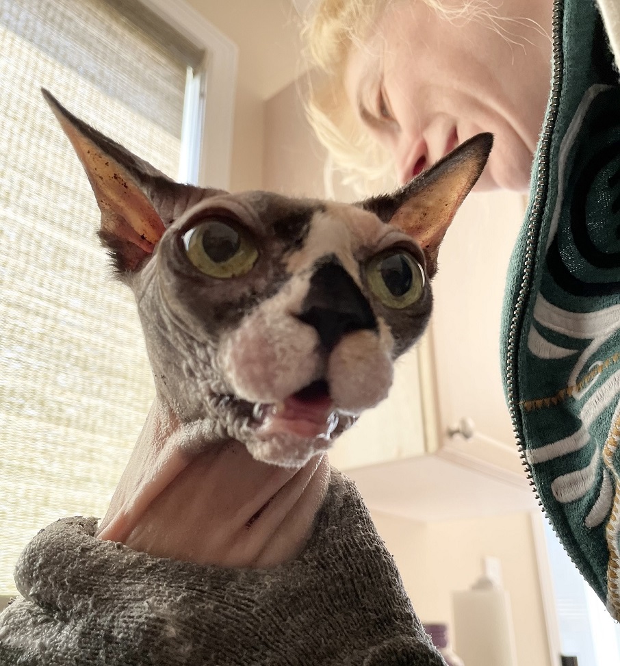 Since our kitties are hairless (sphynx) cats, they need to be bathed regularly. Some more often than others. Mya doesn’t need one often which is good because she screams like a raging lunatic for the first thirty seconds or so. Then it’s just the odd louder than normal meow here and there. Each cat takes less than five minutes from first being put in the sink to being dried off. Short and sweet. Pinky lets out a few growls here and there but generally takes it well, for the adorable pink blob that she is. Boo goes into full rigor mortis mode, scrunching up and making almost every wrinkle and fold as inaccessible as the bellows on an accordion. She’s always the greasiest too. Then we have little Abby. She sits still and only does a few small mews during the process. Most baths, she gifts us with this most amusing face: