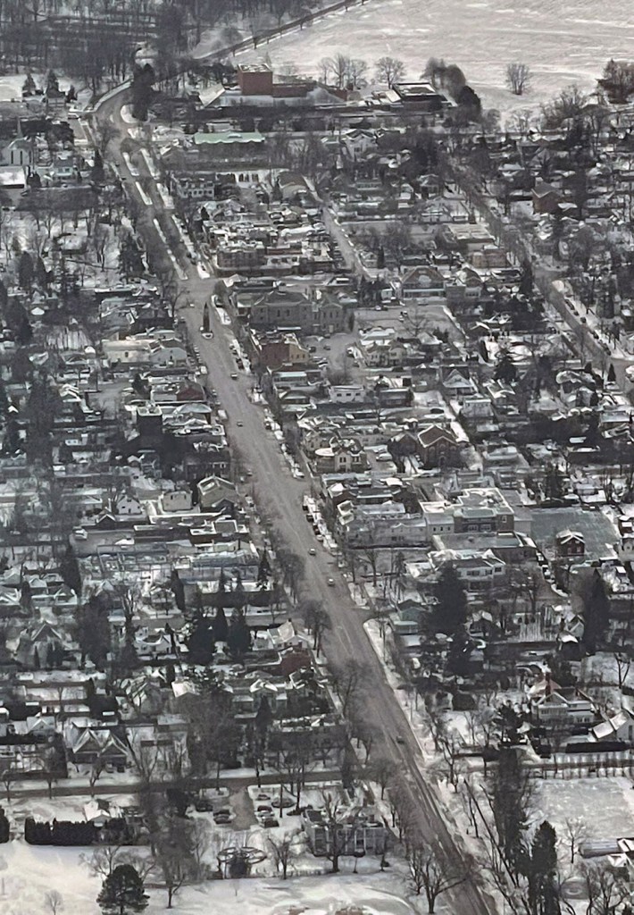We flew west briefly, then back east along the shoreline over to the town of Niagara-On-The-Lake. The main street was looking so empty: