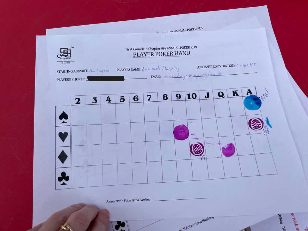 We participated in The 99’s Poker Run on Saturday. This is the third or fourth time we’ve done so and it’s always a blast. We took off from St. Catharines by 8:45 and arrived at the Burlington Airport around 9:15. I don’t think they were expecting people to start so early, especially with the high winds. Two 99 members were getting everything set up whilst ensuring we were registered and stamped our play sheets. At the first two airports, you drew two cards towards your hand. One last card is drawn at the final airport. After a pleasant chat, we re-boarded Vyctor and got ready to head to our second destination.