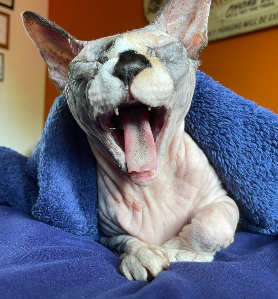 I wish I could say that today was as good as the weekend, but I had to get Mya (my eldest Sphynx) to the vet this morning. She showed no signs of anything being wrong last night. But this morning, she ran to the litter box multiple times. She started doing small pees every ten minutes or so. I was able to collect enough for them to do a urine test. They also did an x-ray to check for any stones in her bladder. Fortunately, the scan was clear. She received an injection of antibiotics and was also sent home with some pain meds. Paws crossed we see some improvements soon!